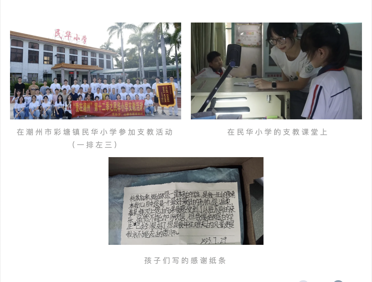 除此之外,李涵也积极参与了许多志愿活动,如学校抗疫志愿活动、广图志愿活动、体育赛事志愿活动等,同时她还两次参与了支教活动,在孩子们的心里埋下一颗颗种子,期待在未来的某一天萌芽。“支教是孩子们与我们的双向奔赴,”谈及支教经历,她说,“我们传授知识给他们,而他们用童真和笑声治愈我们,十分感谢在支教的日子里收获与孩子们之间纯粹的感情。”