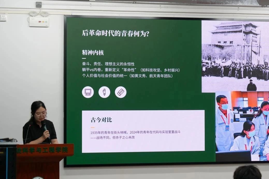 管立宇同学分享革命文学《青春之歌》,从小说故事提炼对当代青年成长的重要启示。从革命者的青春觉醒,理解个人理想与时代使命的统一。她通过历史群体与青年航天工作者的奋斗联系,指出书中的人物成长和思想觉醒为当代青年提供了宝贵的精神财富和行动指南。