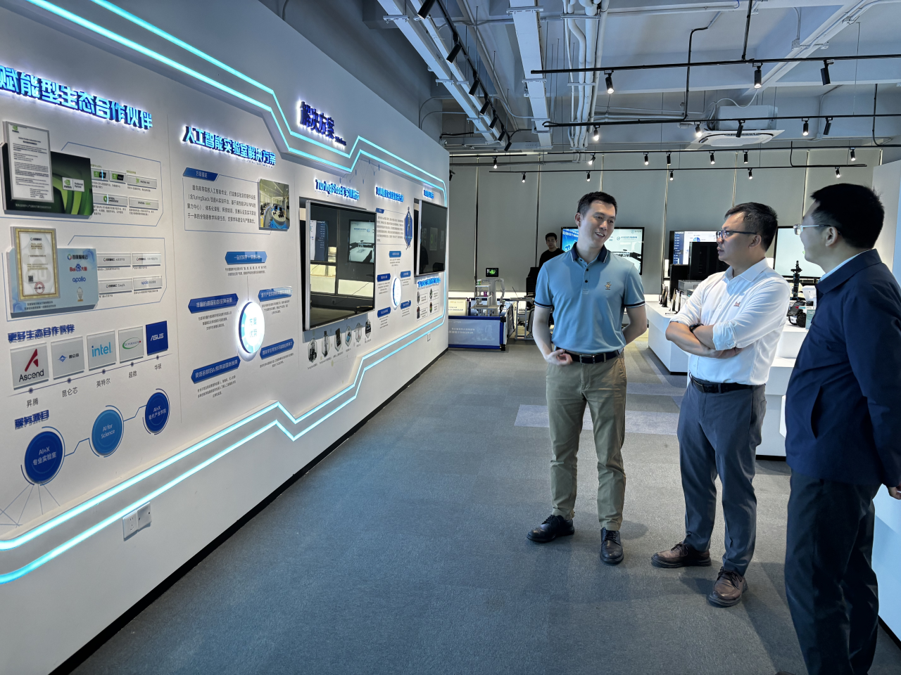 师生进行了详细的讲解。展厅陈列了图灵智新公司自主研发的硬件与软件成果,展示了公司在具身智能领域从传感、感知、决策到执行的闭环能力,以及与百度、NVIDIA等行业巨头的协同合作模式。师生们对于图灵智新公司有了更清晰准确的了解。