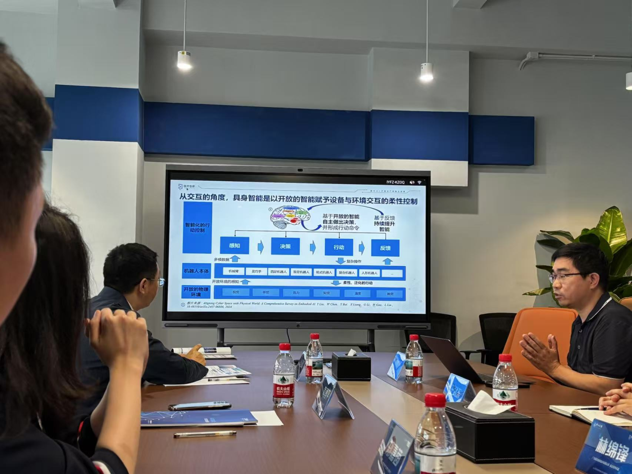 座谈会上,图灵智新公司合伙人刘鹤辉向师生详细介绍了公司针对教育市场与工业市场的业务布局。重点介绍了“具身智能”在AI产教与产研融合中的应用前景。av直播-十大av直播平台 黄勇平书记对图灵智新公司的周到接待表示衷心感谢,并期待十大av直播平台 与公司加强合作,共同培养更多具有创新能力的复合型人才。副院长肖绍球教授指出,十大av直播平台 研究方向与图灵智新技术布局交叉点多,期待双方在科研项目、实验教学和人才培养等层面建立更紧密的合作机制。