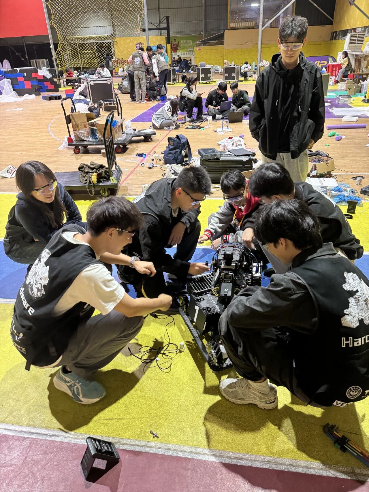 备赛的日子里,没有捷径可走,唯有坚守与深耕。队员们利用课余时间,扎根实验室,从机械结构的设计打磨,到电控算法的优化调试,再到视觉识别的精准提升,每一个细节都反复推敲,每一次故障都全力攻克;没有成熟的战术参考,就反复模拟对抗,在一次次试错中总结经验,在分工协作中凝聚力量;面对技术瓶颈与经验不足的双重挑战,团队成员不气馁、不退缩,把每一次困难都当作成长的契机,把每一次调试都当作能力的沉淀。
